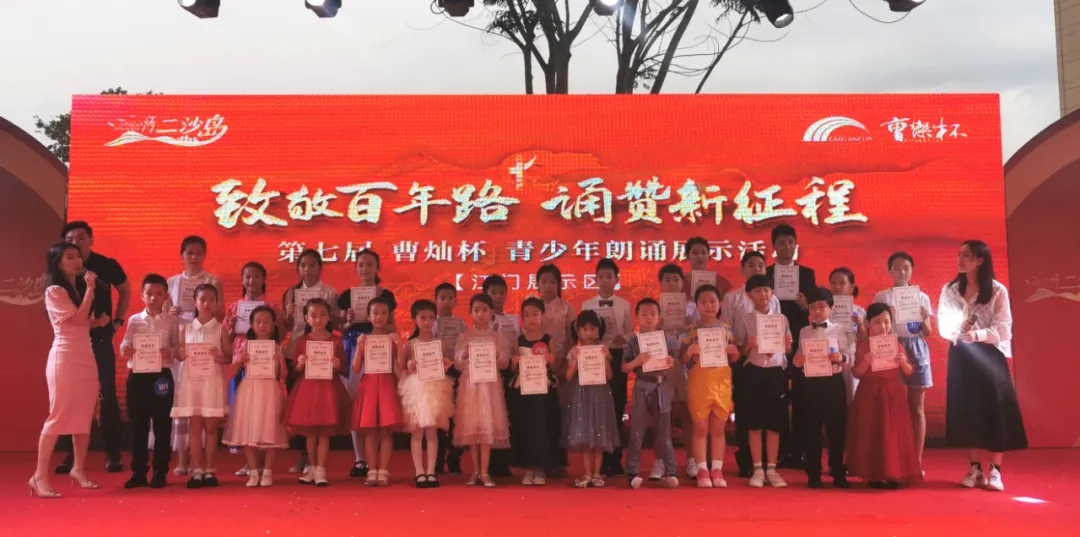 同天,以“致敬百年路·诵赞新征程”为主题的第七届“曹灿杯”青少年朗诵展示活动江门海选在江门二沙岛火热进行。本次大赛共吸引全市500余名朗诵爱好者报名参赛,其中年龄最小的仅3岁半。不少少年朗诵爱好者轮番登场,为大家奉上或慷慨激昂,或委婉动人的表演;舞台下,家长拿着手机记录孩子的精彩瞬间,老师不断为选手加油鼓劲,不停有路人驻足观看……